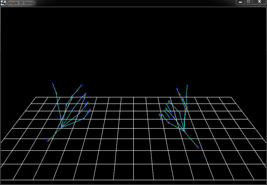 The DrawSkin example demonstrates visualizing a 3D model of the hand using smooth skinning and the calibrated hand model. The USER message sent at the beginning of each connection provides the user name and the calibrated, skinned model for each hand. We use linear blend skinning to deform the hand model according to the skeletal pose, given in the POSE messages.